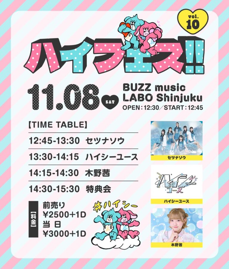 11/8(土)主催ライブ「ハイフェス!! vol.10」 詳細情報解禁! ■日程・会場 2025/11/8(土) BUZZ music LABO shinjuku OPEN:12:30 /START 12:45 ■チケッ […] -